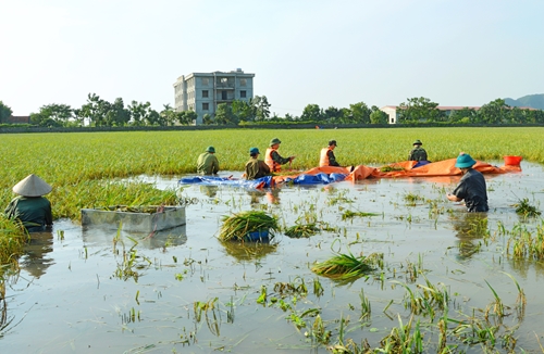 350师官兵帮助宁平省宁平市群众收割水稻