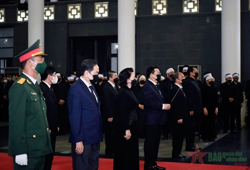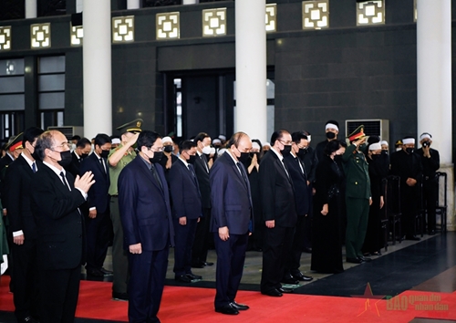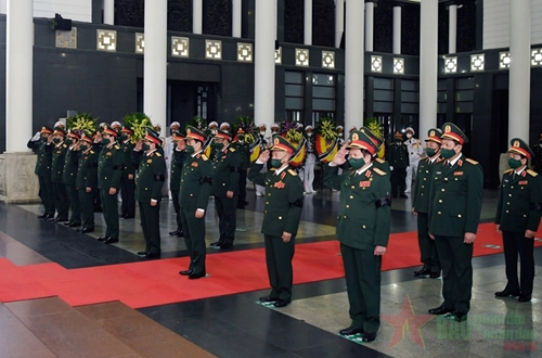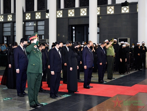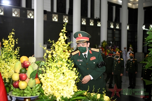 代表团怀着无限的悲痛向冯光青大将致敬:越共中央政治局委员、国家主席阮春福率领越共中央委员会代表团和越南社会主义共和国主席代表团,越共中央总书记阮富仲送花圈慰问,原越共中央总书记农德孟、原国会主席阮生雄和原国会主席阮氏金银等出席仪式。
