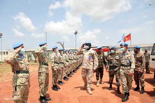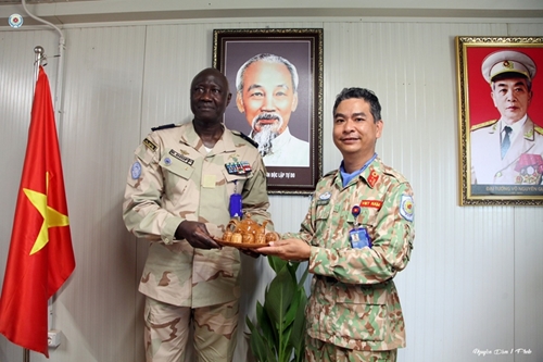 联合国驻南苏丹特派团部队司令谢里什•迪耐卡尔(Shailesh Tinaikar)中将随团。越南三号二级野战医院有幸在比拉姆•迪奥普大将于10月4日至6日访问南苏丹团结州本提乌联合国基地期间欢迎他来访。