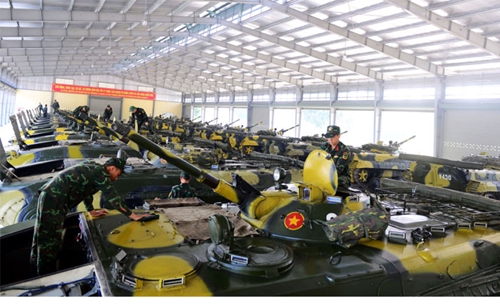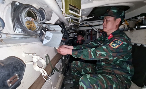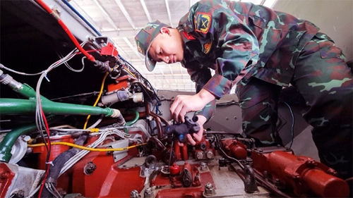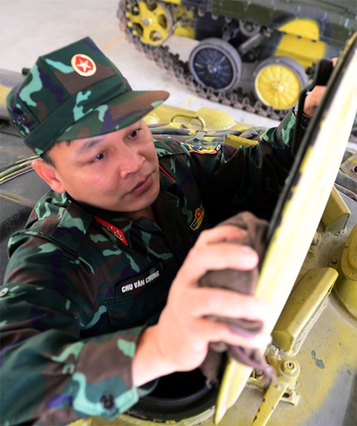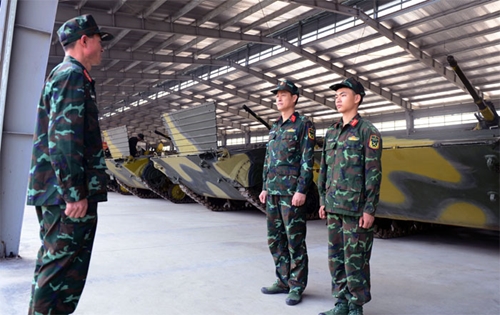 对BMP-1车机舱内的设备进行保养(图片来源:人民军队报)