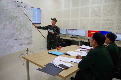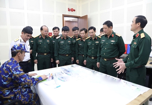 越共中央委员、越南人民军副总参谋长黄战胜中将对考生制作作战计划进行检查。