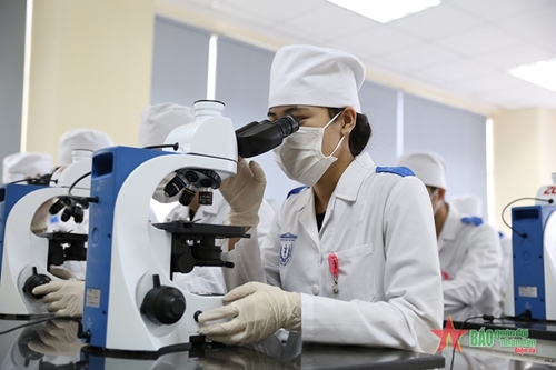 军医学院学学员周氏娴下士使用显微镜观察细胞。