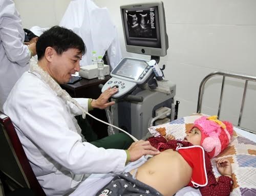 黎友卓国家烧伤医院影像诊断科主任邓德景大校为一个儿童做B超
