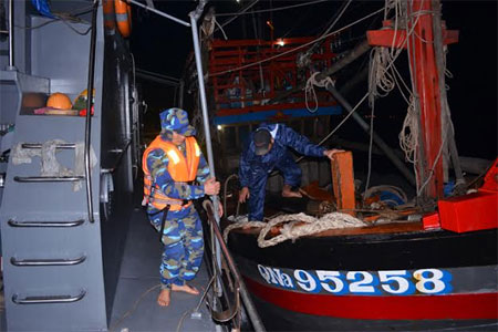 人民军队记者国武报道:经过十二个多小时进行搜寻,1月1日凌晨,海上遇险的QNa 95258号渔船被广南省边防部队2海队安全拖回岘港港口。