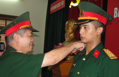 | 河内首都司令部司令费国俊少将为阮英俊少尉予以表彰并颁发国防部长授予的荣誉证书。 (图片来源:人民军报) |