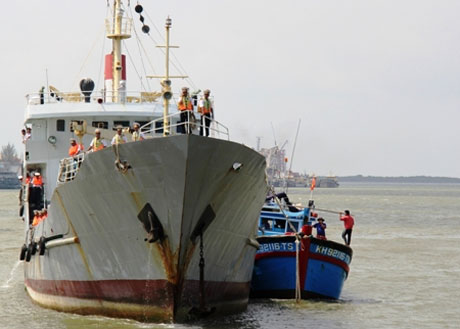 | 军二区司令部HQ608号船拖拉KH92116号渔船安全靠岸(图片来源:人民军队报) |
