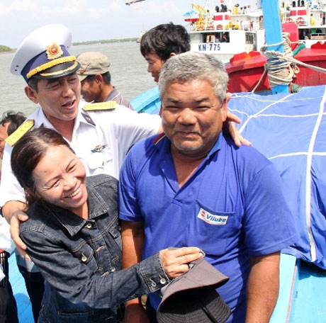 庆和省牙庄市KH-92116渔船船长黄离夫妻与海军官兵分享团聚时刻