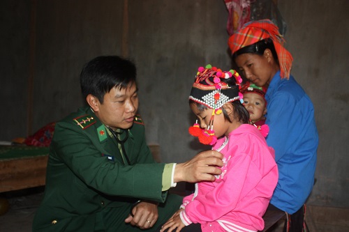 | 黎青桂中尉给少数民族儿童免费看病(图片来源:人民军队报) |