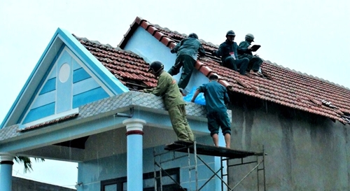 龙卷风过后,民兵战士在广义省山静县静协乡帮助人民重新盖屋顶(图片来源:人民军队报)