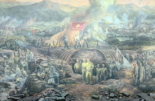 奠边府历史大捷博物馆的全景图再现了德卡斯特里碉堡屋顶上飘扬的“决战决胜”旗帜和奠边府战役期间投降的法国战俘队伍(图片来源:人民军队报) |