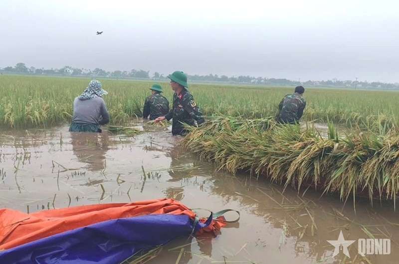 在富寿省贤良乡1区的田野上,第二军区后勤技术局K5仓库的数十名官兵也正紧张地帮助民众保护多日来的劳动成果,特别是帮助优抚家庭、孤寡户和困难家庭。仅在仓库官兵下田的第一天,贤良乡1区民众的数十公顷水稻便已收割完毕。官兵们将稻谷装入麻袋,运送到每个农户家中。