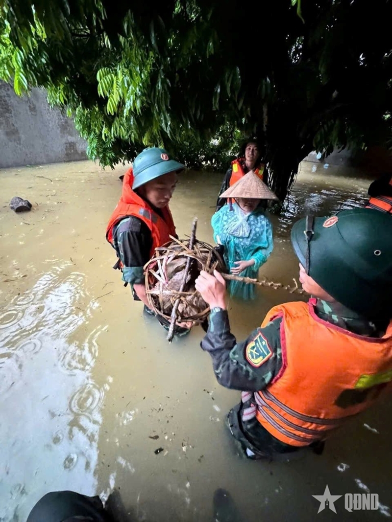 在三进乡,白勒(Bãi Lát)、占(Chàm)、㖼狀(Mỏ Trạng)、进盛等村的16户居民房屋被洪水淹没。武装力量帮助群众将人员、财产转移至高地。民兵力量保持执勤全天制,引导人民不要通行因滑坡受阻的17号国道路段。在安世乡,北宁省军事指挥部已调动高速艇,将被困群众转移到安全地区。