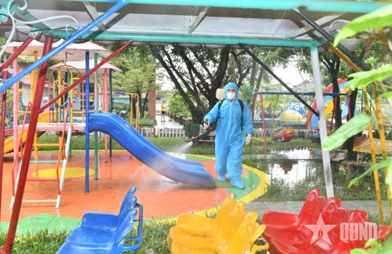 顺化市军事指挥部军医在清水坊水阳幼儿园喷洒消毒剂(图片来源:人民军队报) |
