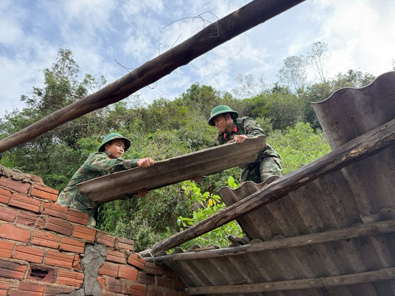 第五军区2师官兵协助得乐省绥安东乡居民修复洪水过后的屋顶(图片来源:人民军队报)