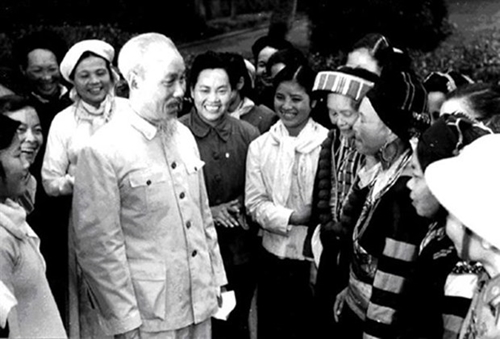 资料图:胡志明主席和于1961年3月出席第三次越南全国妇女代表大会的代表交流(图片来源:越通社) |