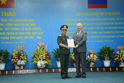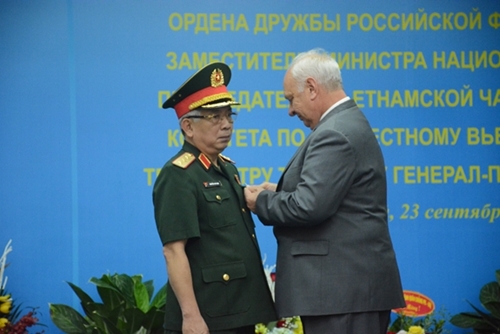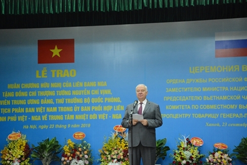 仪式上,受俄罗斯联邦国家的委托,俄罗斯驻越南特命全权大使康斯坦丁•弗努科夫公布了俄罗斯总统普京的奖励决定,并向阮志咏上将授予友谊勋章。