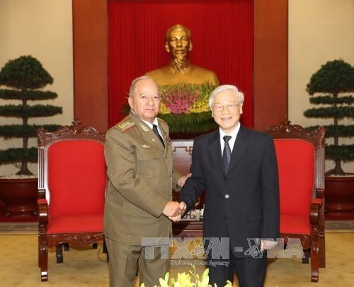 来奥波尔多.辛德拉.夫利亚斯上将对阮富仲总书记拨冗会见深表感谢,向阮富仲总书记与越南党、国家领导人转告劳尔·卡斯特罗同志的亲切问候;高度评价越南在革新开放和社会主义建设事业中所取得的成就,将其视为古巴经济模式更新的宝贵经验,并深信越南继续在革新事业中取得新的更大成就。莱奥波尔多·辛特拉·弗里亚斯部长向阮富仲总书记通报他与越南国防部各机关和单位会谈结果;介绍古巴近期情况;感谢越南党、政府和人民一直以来对古巴的支持和帮助;重申了古巴愿进一步巩固和推动两党、两国和两国人民特殊关系的决心。