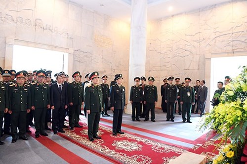 越中两国国防部高级代表团为胡志明主席默哀一分钟,缅怀他老人家对越南革命事业和建立越中团结友好关系的巨大功劳。(完)