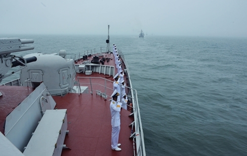 015号舰的官兵向高级领导舰艇致敬(图片来源:人民军队报) |