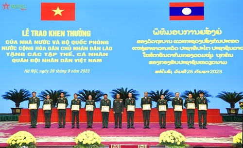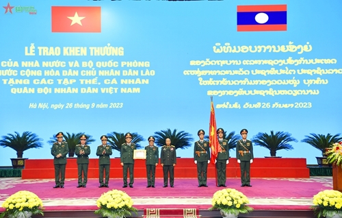 通莱•西力冯上将、老挝驻越南大使森菲特•宏本让和松通•丰拉冯中将向越南人民军集体和个人颁发劳动勋章、英勇勋章、荣誉证书。