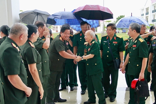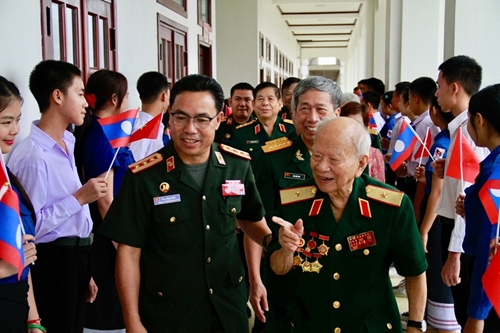 老挝人民军队文化民族寄宿学校政委Saveang Deannamon大校、博士及学校党委、指挥员、干部、教师以及学生欢迎越南援老前志愿军和军事专家代表团的访问。