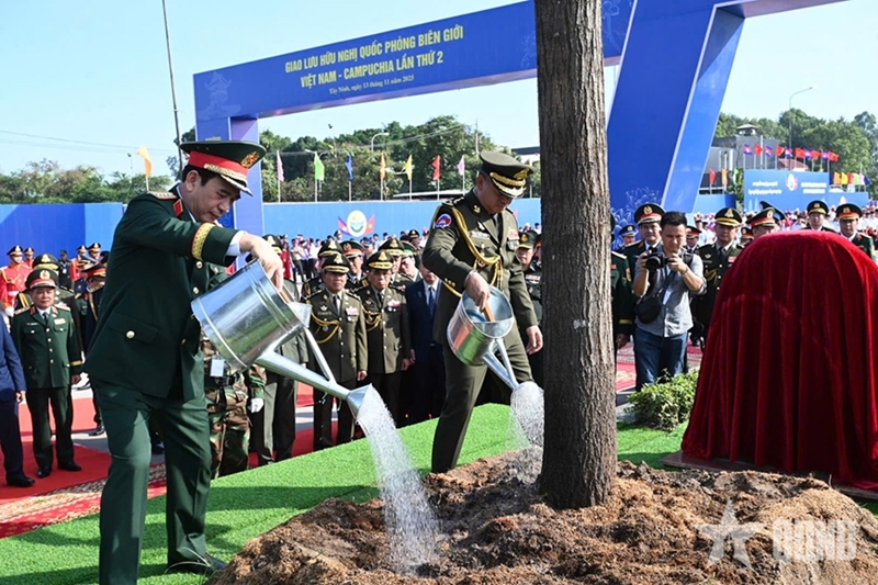 潘文江大将和迪阿•赛哈大将共同种下友谊树,并共同观摩两国戍边力量的联合巡逻活动。