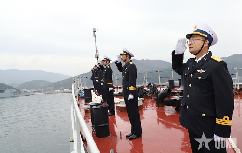 当地时间上午10时,在码头举行了欢迎仪式。越南国防武官黎协林大校及越南驻韩国武官处干部参加欢迎仪式。