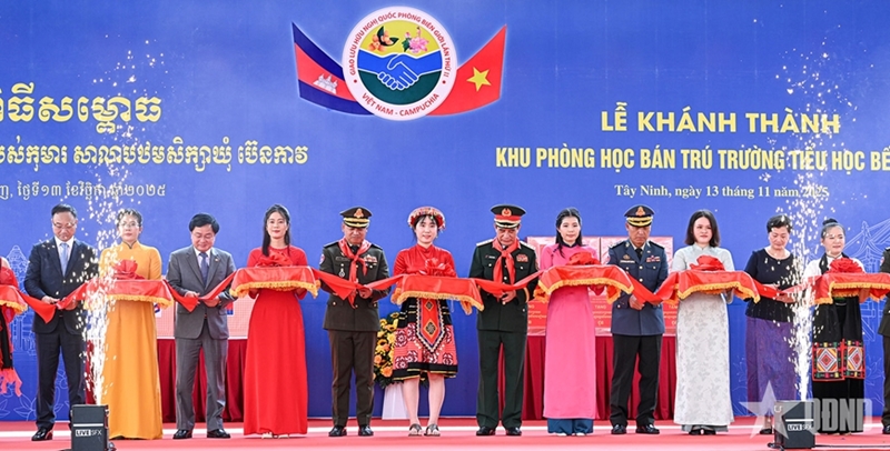 2025年11月,越共中央政治局委员、中央军委副书记、国防部长潘文江大将与柬埔寨副首相、国防部长迪西哈大将及各位代表共同为由越南国防部援建的西宁省边桥小学寄宿教学楼剪彩揭幕。该工程是在第二次越南—柬埔寨边境国防友好交流活动框架内建成(图片来源:人民军队报) |