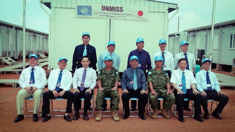 在2013年6月23日,为制定组建越南“蓝盔”部队计划而进行的行前考察中,由时任越共中央委员、国防部副部长阮志咏上将率领的跨部门工作代表团已抵达南苏丹——这个动荡不安、贫困落后、困难重重,同时也是 UNMISS 执行任务的国家。当时参加代表团的还有:公安部副部长苏林中将(今是越共中央总书记、中央军委书记);越南人民军队副总参谋长潘文江少将(今是大将,政治局委员、中央军委副书记、国防部长),越南人民军队总政治局副主任阮仲义少将(今是大将、政治局委员、中央书记处书记、中央军委常委、越南人民军队总政治局主任);越南常驻联合国代表团团长黎怀忠大使(今是政治局委员、外交部长)等。那次考察的记忆就留住在一张工作代表团成员在当时日本工兵队驻地前合影的照片。