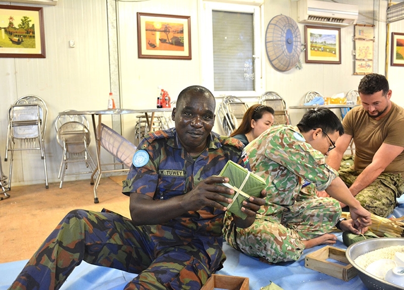 在七号二级野战医院食堂内,国际同事们专注地观看越南维和官兵包粽子的过程,就像在欣赏一场引人入胜的艺术表演一样。Stephen Tuwey少校兴奋地举起自己在越南同事的热情指导下亲手完成的粽子合影留念。Unity分区后勤保障部门的加拿大籍Pierre Fradettte少校表示,“看起来并不难,但真正动起手来才发现,包越南粽子也是一门艺术。”(未完待续)