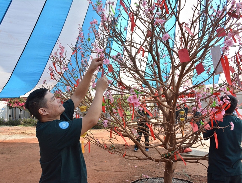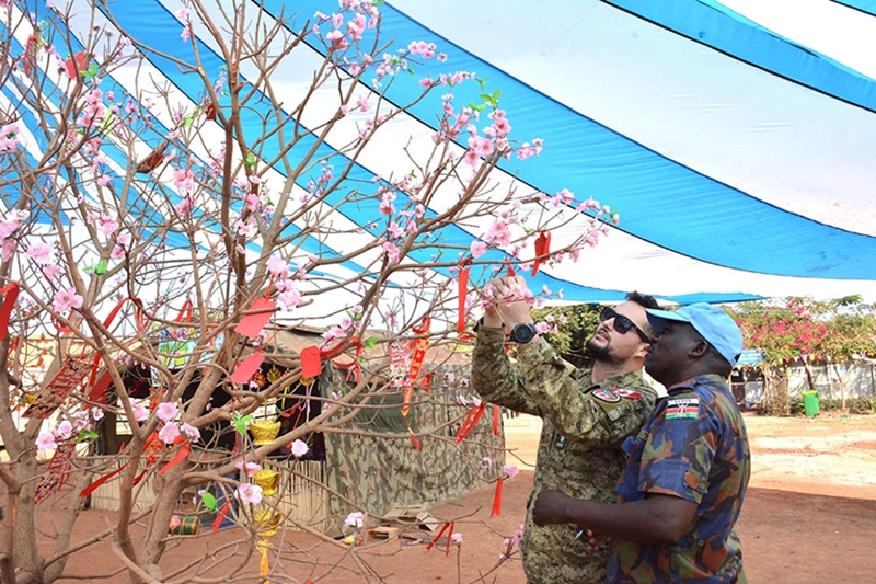 “祝愿七号二级野战医院圆满完成在南苏丹的使命,为这个国家带来和平。祝越南同事春节快乐!”,隶属Unity分区后勤保障部门的肯尼亚籍Stephen Tuwey少校在红纸上认真写下祝福,并挂在桃花树上。