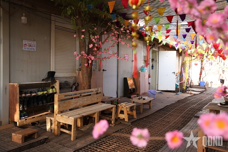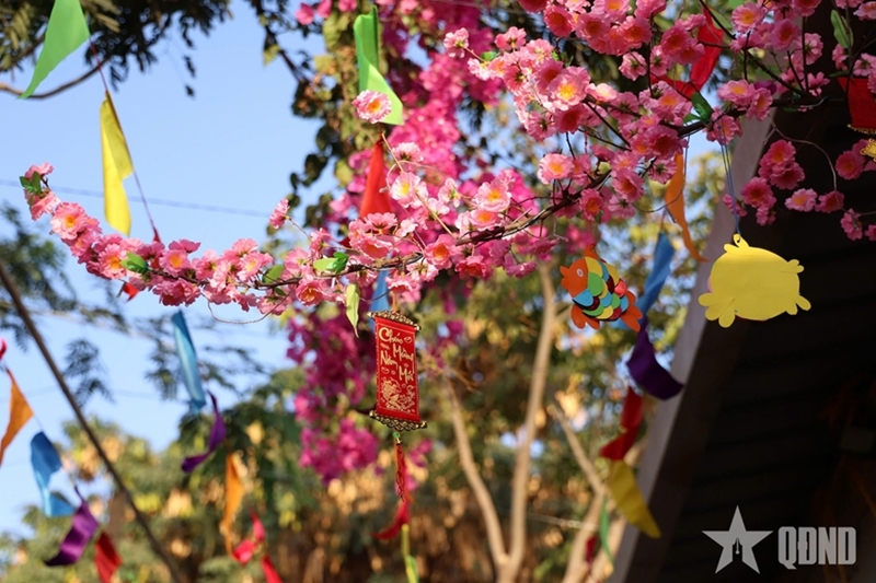简朴装点的梅花枝、桃花枝为单位增添了春意。“新春集市”的小小摊位、战友之间和与国际友人互致的新春祝福,这一切交织在一起,在这片仍充满不安的土地上营造出一个“越南春节空间”。