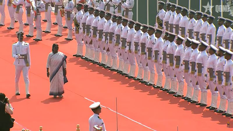 仪式的亮点是印度总统、武装部队最高统帅德劳帕迪•穆尔穆(Droupadi Murmu)亲自检阅在外海锚地集结的舰队编队。由印度国产的INS Sumedha号近海巡逻舰担任总统邮轮,迎接国家元首并率领荣誉编队依次通过各参阅舰艇编队。