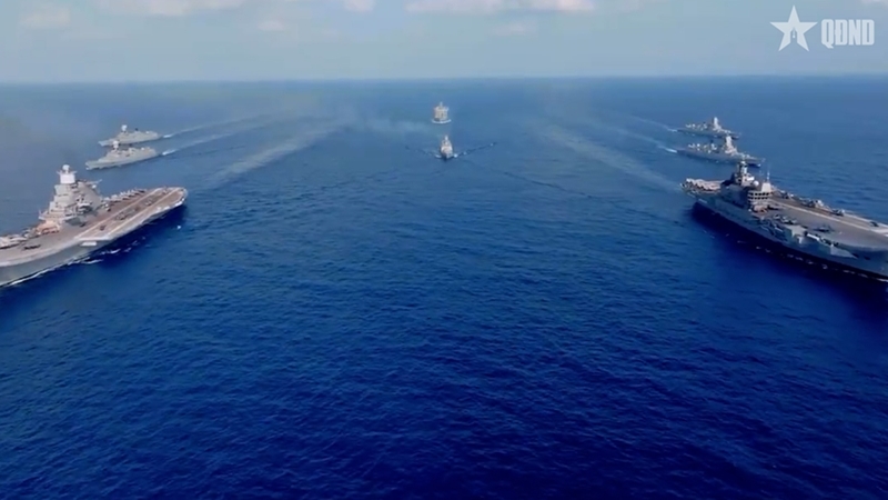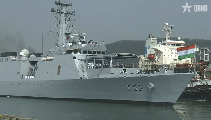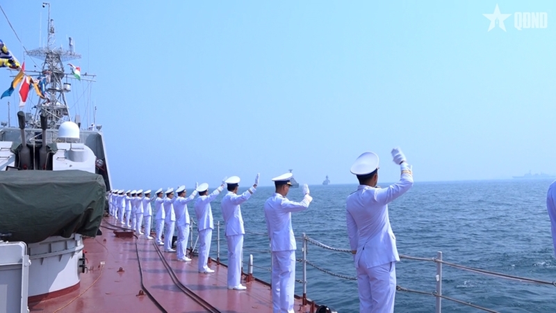 在阅舰编队中,越南人民海军17号舰停泊于第三列位置,依照条令向印度总统致以检阅敬礼。越南国旗在多国海军编队中迎风飘扬,已留下深刻印象,展现了越南海军官兵正规化、专业化和高度责任的良好形象。17号舰的参与有助于加强交流与互信,彰显越南在维护地区和平稳定与海上安全方面的积极主动作用。