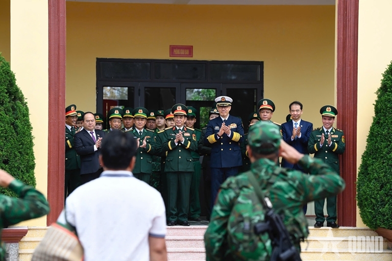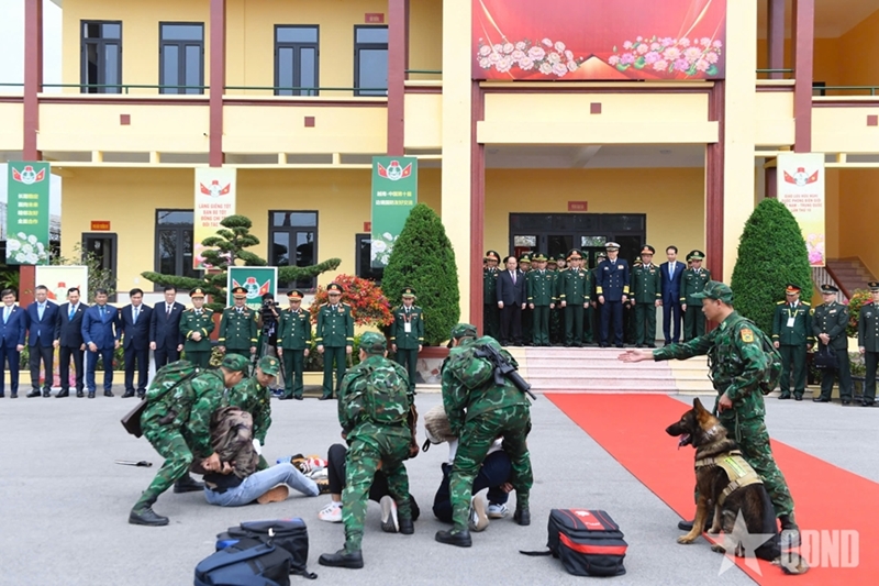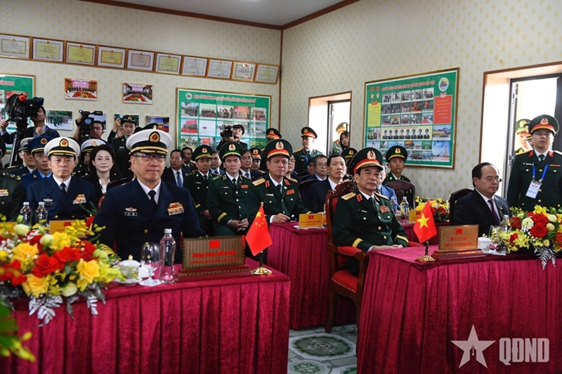 茶古边防屯屯长陆征德中校向两位部长及两国代表团汇报了2025年茶古边防屯与中国防城地区边防部队在边境管理与保护配合工作中取得的成果。