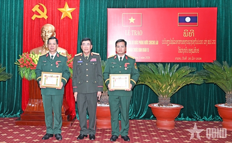 据此,老挝国防部向15兵团党委书记、副司令屈伯高大校和15兵团副司令阮鸿蓝大校颁发二等英雄勋章。