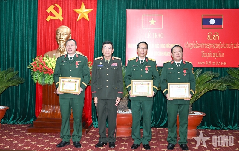 老挝国防部向樛德懋上校、阮春县上校、阮比寅中效颁发三等英勇勋章。