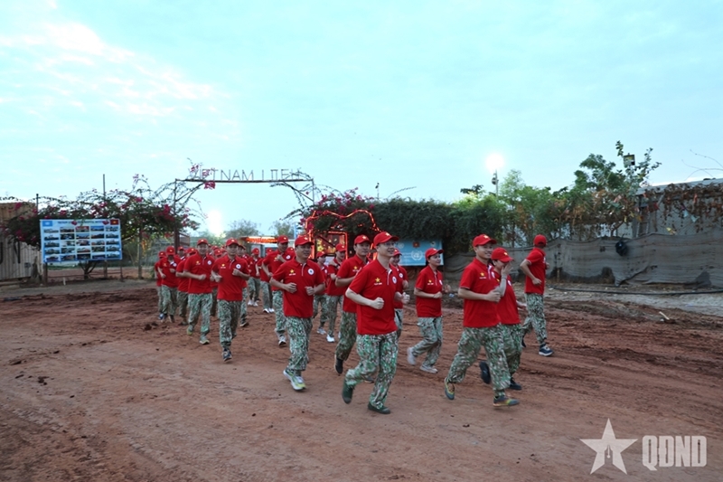 随后,七号二级野战医院全体干部人员在驻军地区内参加了集体跑步活动。他们队形整齐,保持适当距离,活动已充分展现认真、严谨的体力训练精神。身着红色制服、头戴国旗贝雷帽的队员们步伐整齐划一,营造出活力四射的氛围,肯定了越南蓝色贝雷帽部队在国际环境中的意志、本领和正规精神。