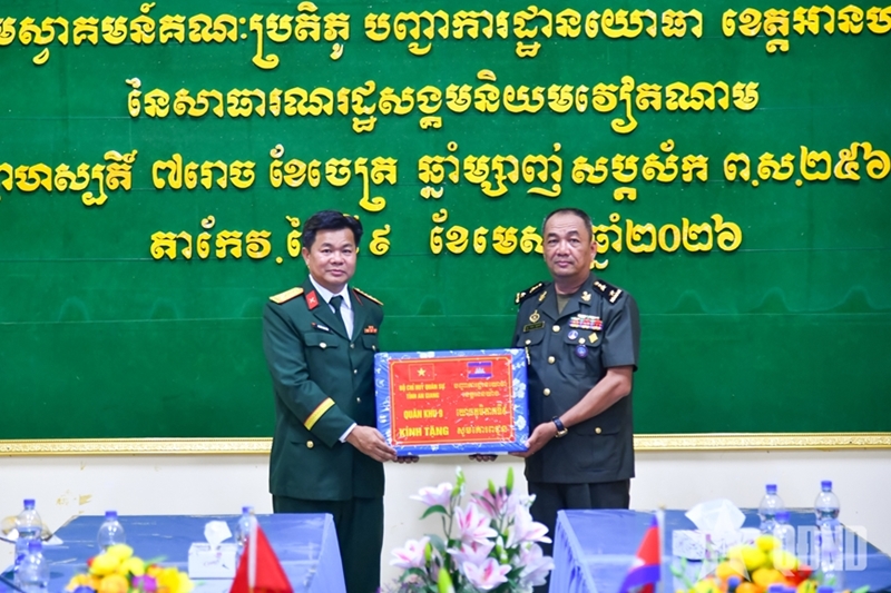 在温馨融洽、充满友谊的氛围中,安江省军事指挥部工作代表团向驻扎在Phnom Den口岸哨所、茶胶省军事小区、磅士卑省军事小区的干部和官兵致以诚挚的新年祝福,祝愿大家在新的一年里身体健康、幸福美满、事业顺利。