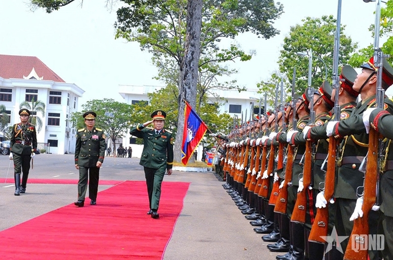 *4月22日下午,老挝人民革命党中央委员、国防部副部长、老挝人民军总参谋长赛查•库玛西斯上将主持仪式,欢迎阮新疆大将及越南人民军高级代表团对老挝进行正式访问。欢迎仪式结束后,双方举行了会谈。