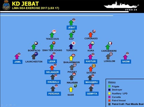 马来西亚东道国军舰10艘与各国军舰15艘参加演习。