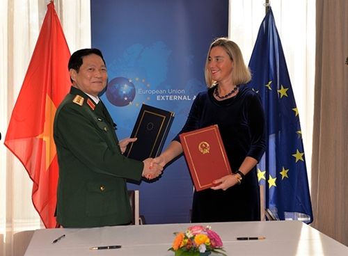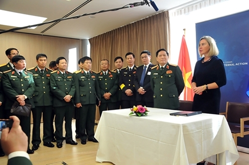 经过双方积极开展谈判和完善内部的手续,受越南政府总理的委托,越共中央政治局委员、中央军委副书记、国防部长吴春历大将与欧盟外事及安全政策高级代表以及欧盟委员会副主席莫格赫里尼(Federica Mogherini)共同签署了该协定。该协定的签署标志着越南与欧盟防务合作关系的重要进展,为深化《越南与欧盟全面合作伙伴框架协议》(PCA)作出贡献。
