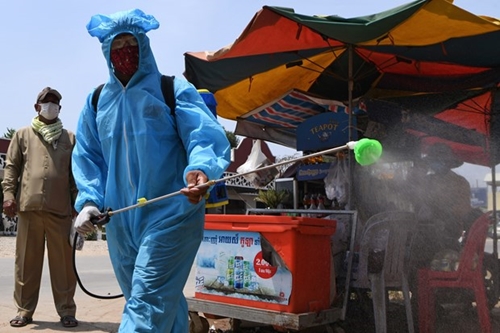 柬埔寨消毒工作人员进行喷药消毒(图片来源:越通社) |