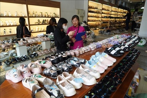 河内市富川县制鞋手工艺村鞋制品展示区(图片来源:越通社) |
