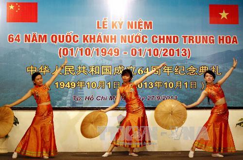 | 中国驻越南胡志明市领事馆举行隆重招待会,热烈庆祝中华人民共和国国庆64周年。图为招待会上的文艺表演(图片来源:越通社) |