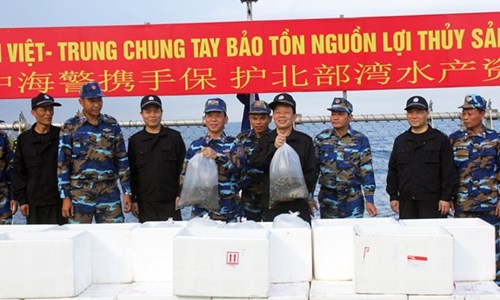 会谈举行之前,双方海警力量在北部湾共同渔区举行放生5万条鱼种的仪式。这是体现两国执法力量在保护海洋资源中的责任感。