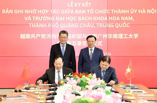 河内市委书记丁进勇与广州市委书记郭永航见证河内市委组织部与广州市华南理工大学的合作备忘录签字仪式(图片来源:人民军队报) |