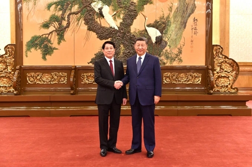 10月11日在首都北京,梁强同志和越南代表团会见了中共中央总书记、中国国家主席习近平,中央政治局常委、中央书记处书记、中央办公厅主任蔡奇。