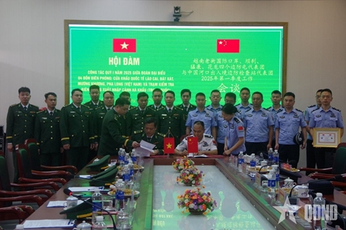 人民军队:越南坝刹、老街国际口岸、猛康、花龙等四个边防屯代表团与中国河口出入境边防检查站和分站代表团的2025年第一季度工作会谈3月27日在老街市举行。