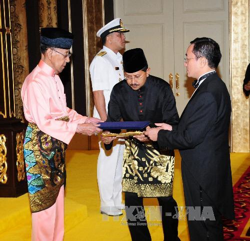 | 范高峰大使(右)向马来西亚国王递交委任书(图片来源:越通社) |
